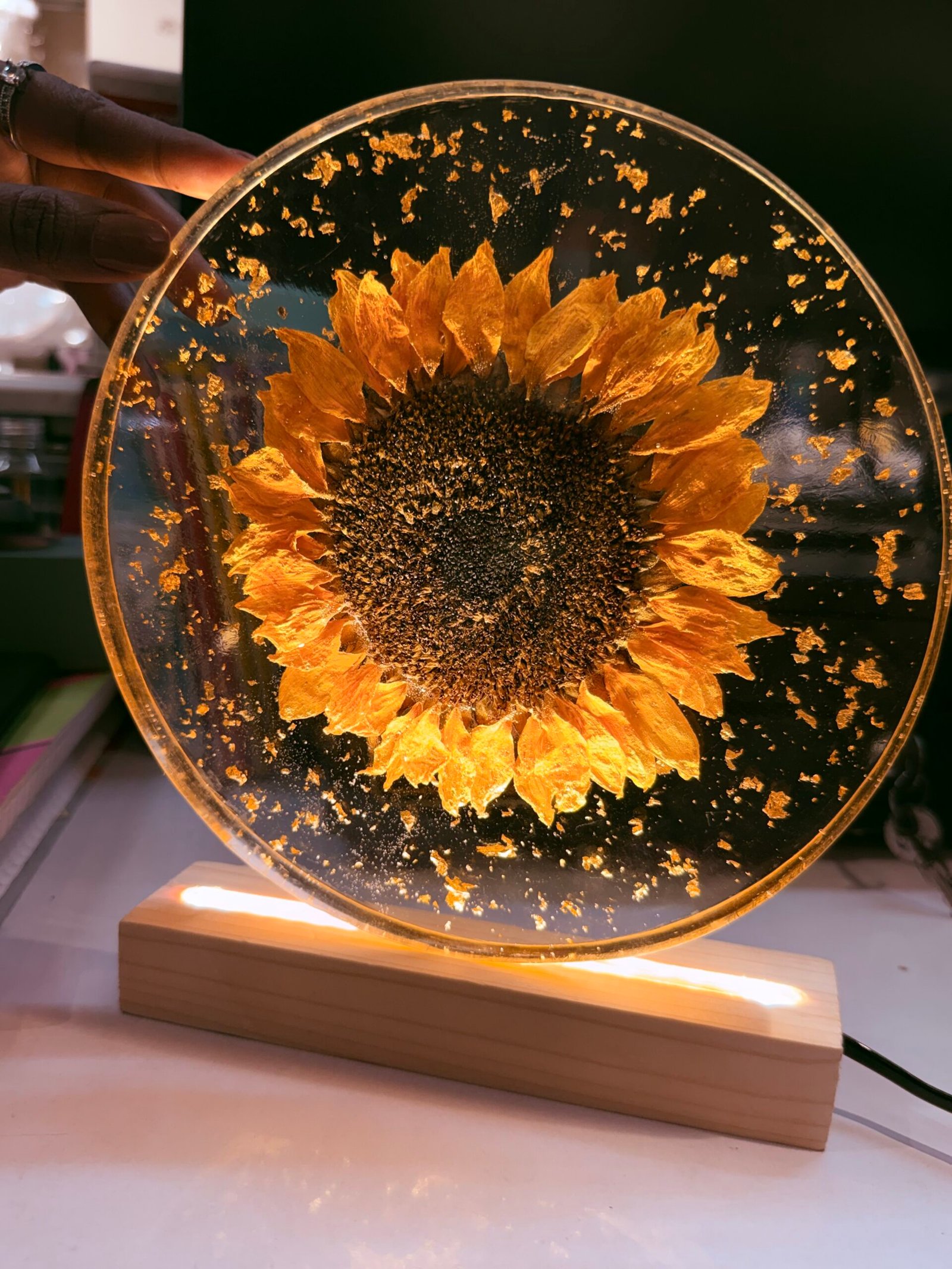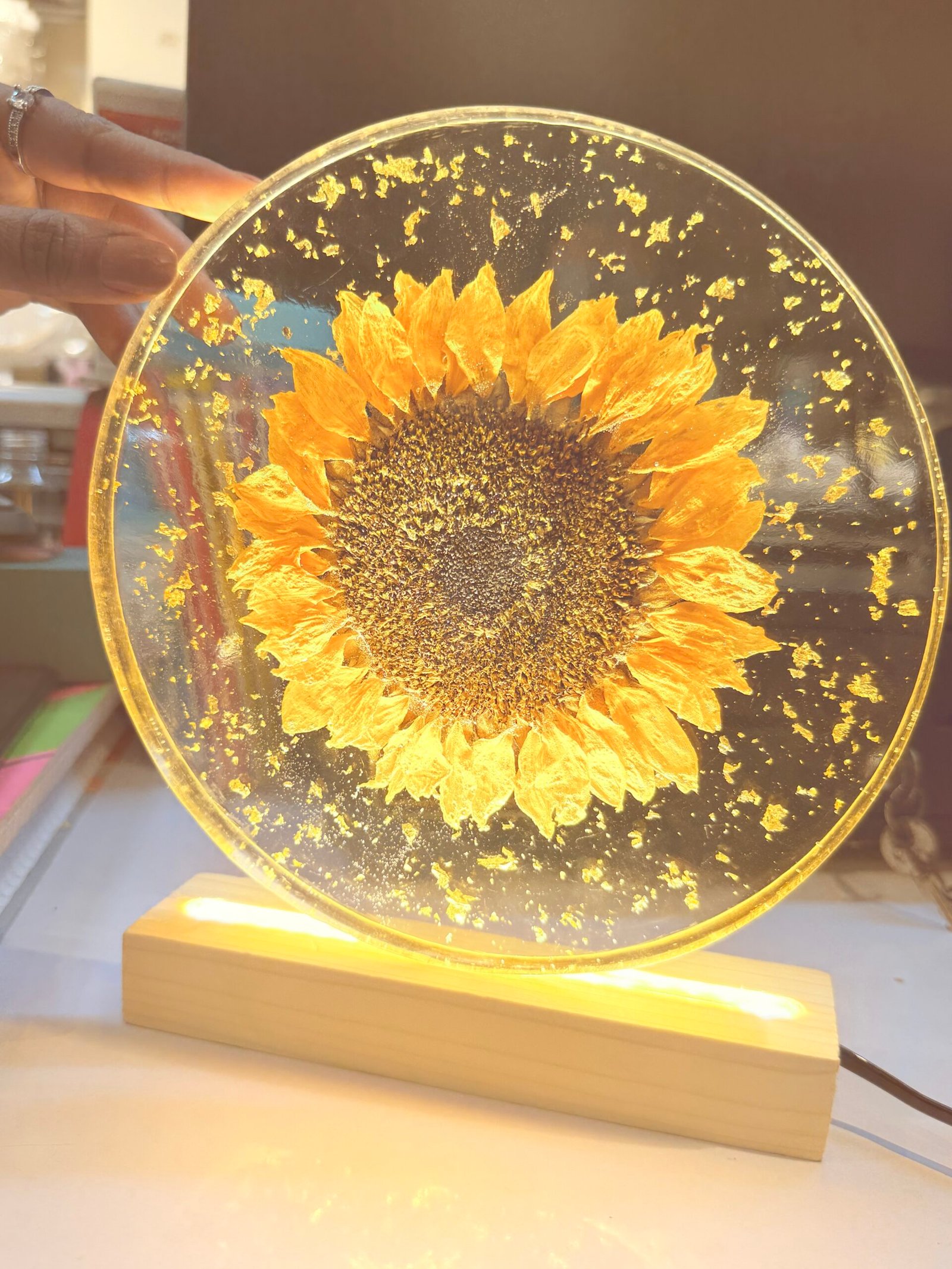 Preserve your precious flowers forever with this Sunflower Preservation Resin Kit. Includes 1.5kg 2:1 epoxy resin, 8-inch deep mould, LED stand, and gold flakes—perfect for creating stunning floral keepsakes, wedding memories, and resin art décor.
